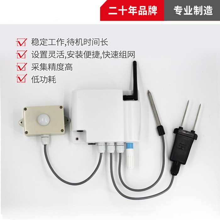 采集、传输一体化设计,超低功耗,可集成多种传感器及变送器,智能管理、智能传输。传输距离远,采用无线2.4G zigbee协议,抗干扰能力更强。16物理信道可选,65535个网络ID可设,组网能力更强。适用于室内环境测量、农业大棚智能管理等。特点:多种传感器高度集成;符合2.4GHz zigbee协议;超低功耗设计,产品寿命长;测量准确度高,抗干扰能力强;网络节点数量大,传输距离远。分体延长线说明:土壤水分:出厂默认3.5m土壤温度:出厂默认3.5m照度:出厂默认2mCO2:出厂默认2mCO2:出厂默认2m